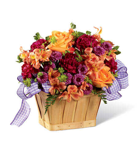 The New Dream Basket from Teleflora is an excellent choice for any occasion. This exquisite arrangement features fresh flowers such as purple carnations, purple button poms, orange Peruvian lilies, and bupleurum, all complemented with lush greens and a lavender gingham ribbon. The entire ensemble comes in a charming woodchip basket that enhances its rustic charm.